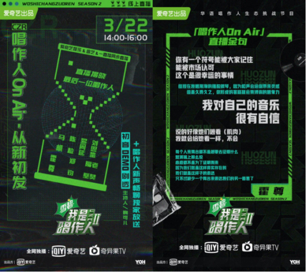前期预热阶段,《我是唱作人2》在宣传形式上大胆创新吊足了观众胃口和注意力。嘉宾阵容作为最大看点之一,节目先是采用了竞猜海报进行“迷惑式”宣传,将嘉宾特征融入海报元素,既暗示明星艺人特点,又与年轻粉丝热衷的话题产生强关联,强烈激发各圈层粉丝的好奇心和活跃讨论将节目热度推向第一波高潮。在随后的官宣阵容阶段,爱奇艺首创沙漏直播形式和“唱作人On Air”云见面会,联动爱奇艺娱乐、综艺和一直播三大平台,通过连续3天4场直播的形式,累计吸引了超818万人数观看,视频点赞量超497万。官宣期间,节目相关话题迅速登上微博热搜,更占据话题总榜第9位,综艺榜第2位,同时在百度热榜、抖音热点、头条热搜、神马热搜、虎扑热帖获百万关注,引爆全平台热议互动。伴随着《我是唱作人2》嘉宾阵容高能官宣,官宣海报、直播金句海报也相继发布,再次强调了节目致敬原创音乐的态度,以及嘉宾率性豁达、保持真我的生活态度,二次引爆用户共鸣和全网讨论。