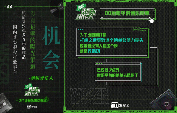 另一方面,除了创新的宣推手法,作为爱奇艺华语唱作人生态挑战节目,《我是唱作人2》有着更大的使命。在聚焦华语原创音乐创作方面,节目联动澎湃新闻开展了一次华语音乐市场生态调查,采访了从业者、消费者、经营平台、媒体人等华语音乐市场链条上的各个环节,进一步发掘探讨音乐“话语权”,激发华语“新声”。同时,针对年轻观众审美口味,节目还联动了会火开展圆桌调查,深入了解00后的对于音乐的心声和看法,助力构建华语乐坛优质生态系统。