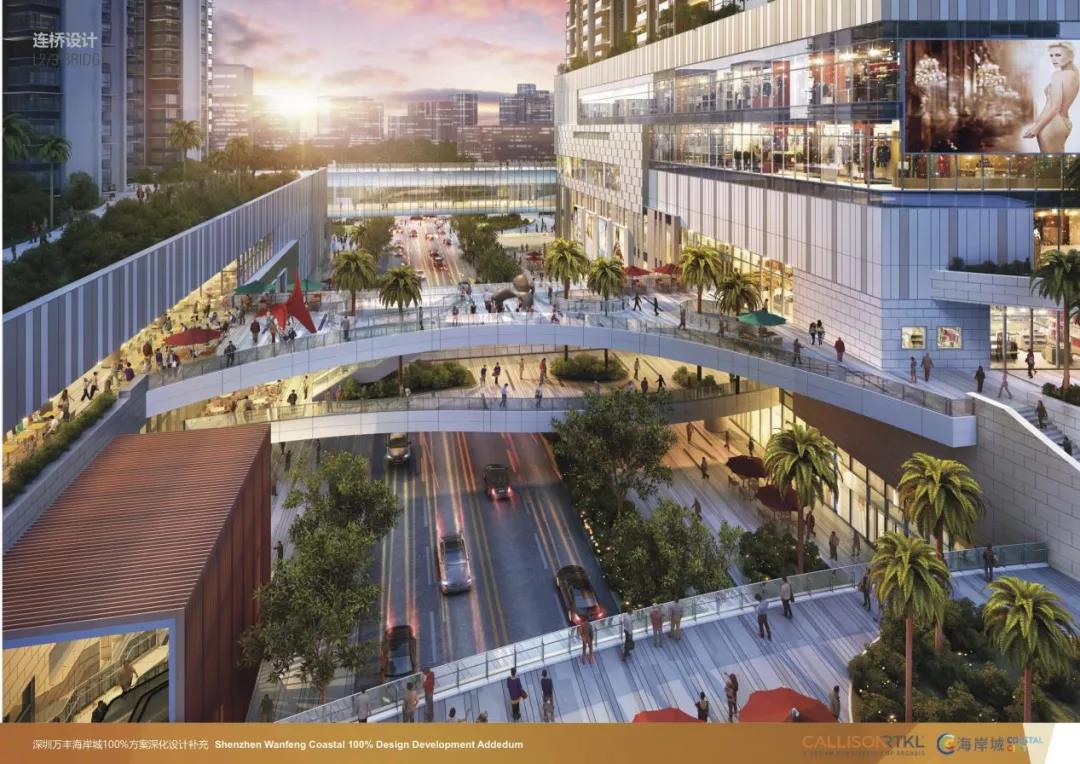 万丰海岸城在南山海岸城连廊系统的基础上升级为双层连廊,打造了3公里的连廊体系,以漫步连廊+空中平台结合区域生态资源,创造出独特的景观坏境,打造都市漫步、城市公共交流空间。