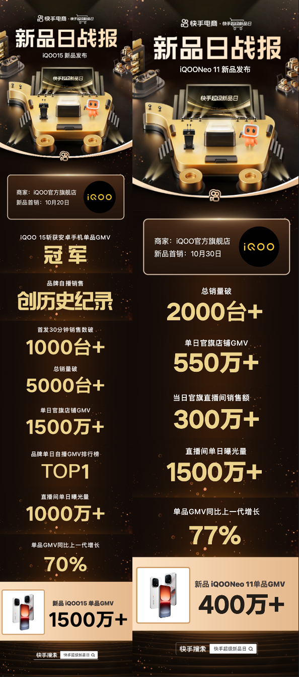 数据显示,10月20日iQOO 15首销大场,新品开售30分钟销量突破1000台,新品GMV超1500万,同比上一代增长 70%,斩获安卓手机单品GMV冠军,品牌自播销售创历史纪录,登上品牌单日自播GMV排行榜 TOP1;10月30日iQOO Neo 11首销大场,新品单品GMV破400万,同比上一代增长77%,单日官旗店铺GMV超550万。