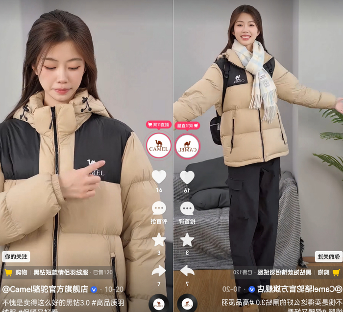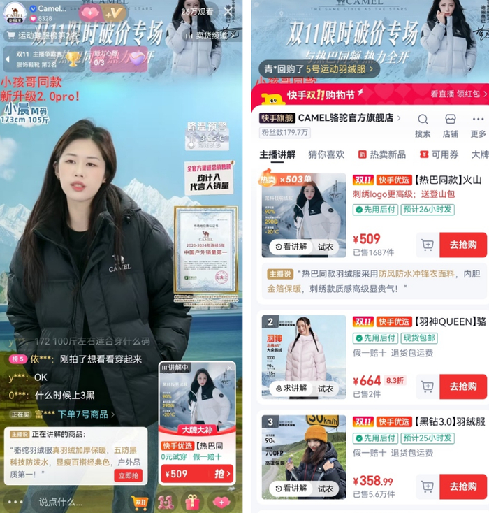 目前,骆驼正以羽绒服为主打,在快手探索全品类的自播销售。随着冬季深入,品牌计划上架更具保暖性能的软壳衣裤等单品,并逐步拓展至春夏户外系列,确保全年货盘的持续活力与市场竞争力。