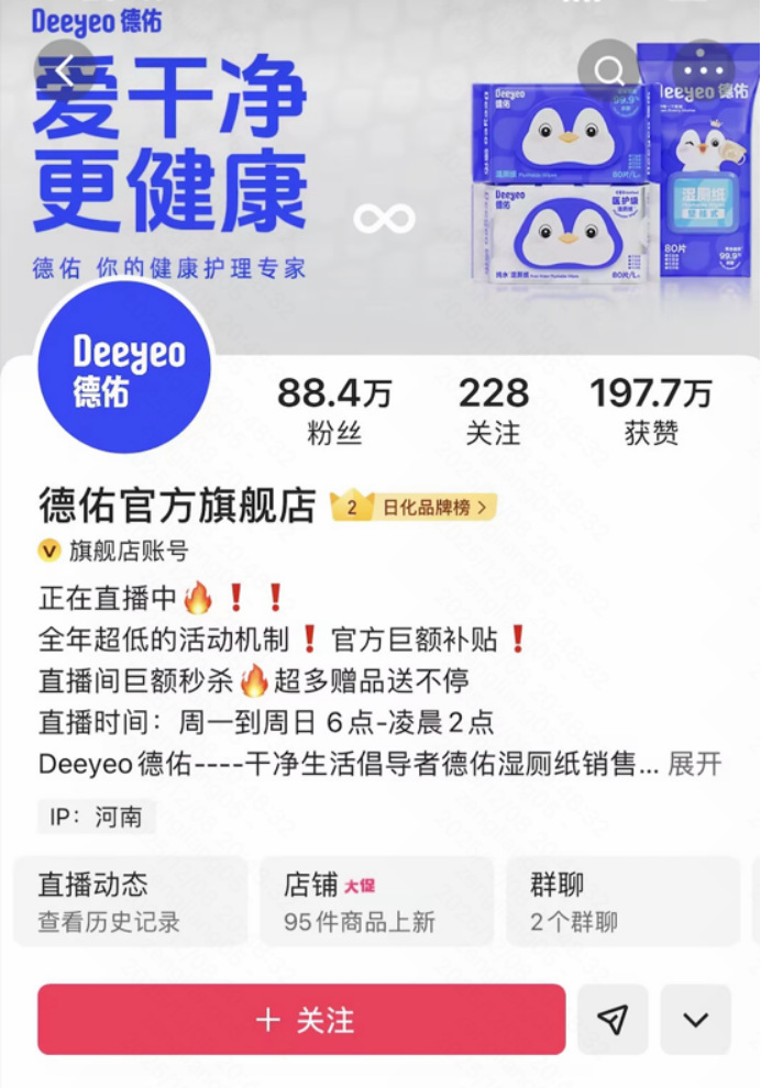 自2020年发力湿厕纸赛道以来,德佑销售规模年增速高达50%-100%,快手电商成为其收获生意增量的一大核心阵地。2020年,德佑入驻快手,在平台持续深耕、加码投入,GMV从2021年的600多万开始快速跃迁。到2025年,德佑快手平台预计全年整体GMV将破亿,同比增幅将达54%。
