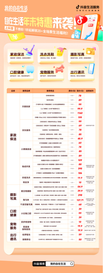 除了深度家务服务,你还可以在主会场一站式发现并囤购其他提升生活幸福感的热门好品:无论是记录重要时刻的海马体精致证件照、打造家庭温馨记忆的爱定格照相馆套餐,还是关爱家庭成员的医直宠专业宠物洗护,抑或是各类风格独特的个人与家庭写真拍摄服务……丰富选择,旨在满足你对美好生活的多维想象,真正实现 “一键囤券,轻松焕新全生活”。