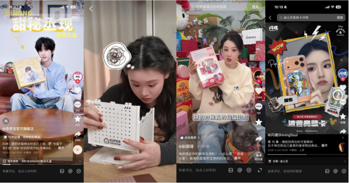 活动初期,通过明星/头部达人的短视频种草,品牌们迅速建立新品认知:奇梦岛邀请刘轩丞担任SiiNONO全球大使,同步推出SiiNONO甜秘丞现限定礼盒,SiiNONO软萌治愈的设计与共情式叙事,备受粉丝和潮玩爱好者的青睐;闪魂联动周也、卢昱晓、程潇等多位明星发布种草内容,强化新品“收藏级”认知,同时产品拓宽了卡牌的展示场景,打造定制挂件和磁吸卡夹,多位明星种草把藏品变为行走的社交货币;Tangle、若来、若客等品牌则通过杜海涛、赵圆瑗等明星的短视频种草,快速触达大众圈层,#杜海涛原来在潮玩赛道、#谁能拒绝赵圆瑗的潮玩年货、#茂茂林子聪来抖音摆潮玩摊了、#张家齐的潮玩阿贝贝绝了 等相关话题纷纷登上抖音热点榜。
